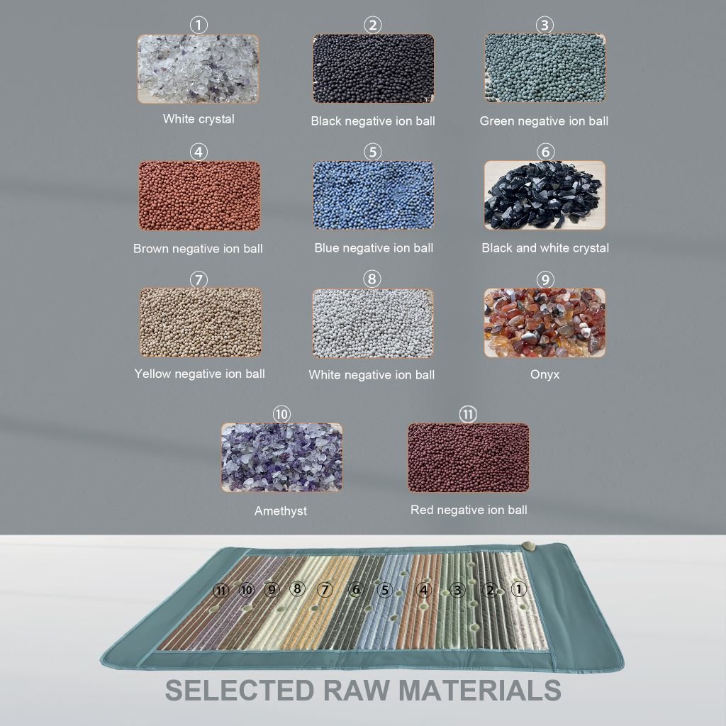 מזרן הקריסטלים מכיל 12 סוגי קריסטלים שחלקם גרוסים, חלקם כ"כדוריות יונים שליליים" ובנוסף אבנים חתוכות ומעוצבות.